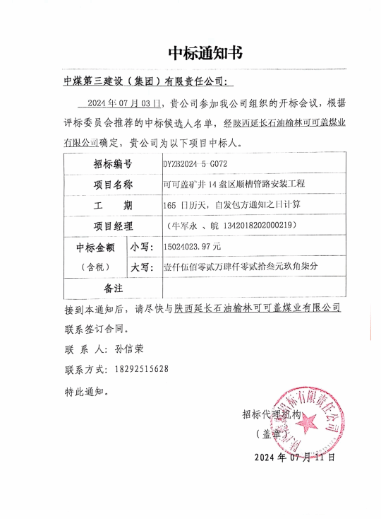 可可盖矿井井下综合管网、11盘区排水泵房、抗灾排水泵房安装工程项目位于陕西省榆林市榆阳区,主要建设内容包括可可盖矿井井下11盘区水泵房、配电室及井下大巷部分消防洒水管道、排水管道、压缩空气管道、注氮管道等安装;排水泵房自动化排水控制系统安装、设备入井运输、设备试验等配套工程,工期为175日历天。